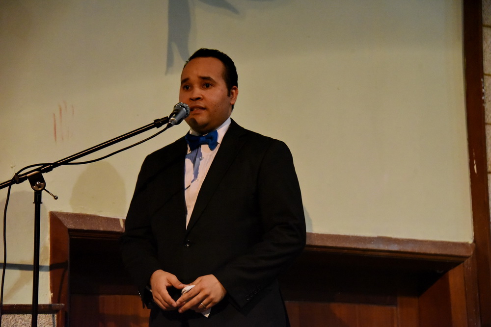 Con sonrisa y cara de satisfacción, elogió, asimismo, a su otrora profesora, la maestra de canto y solista, Pura Tayson, invitada de la noche; quien acudió vestida de traje largo blanco impecable.