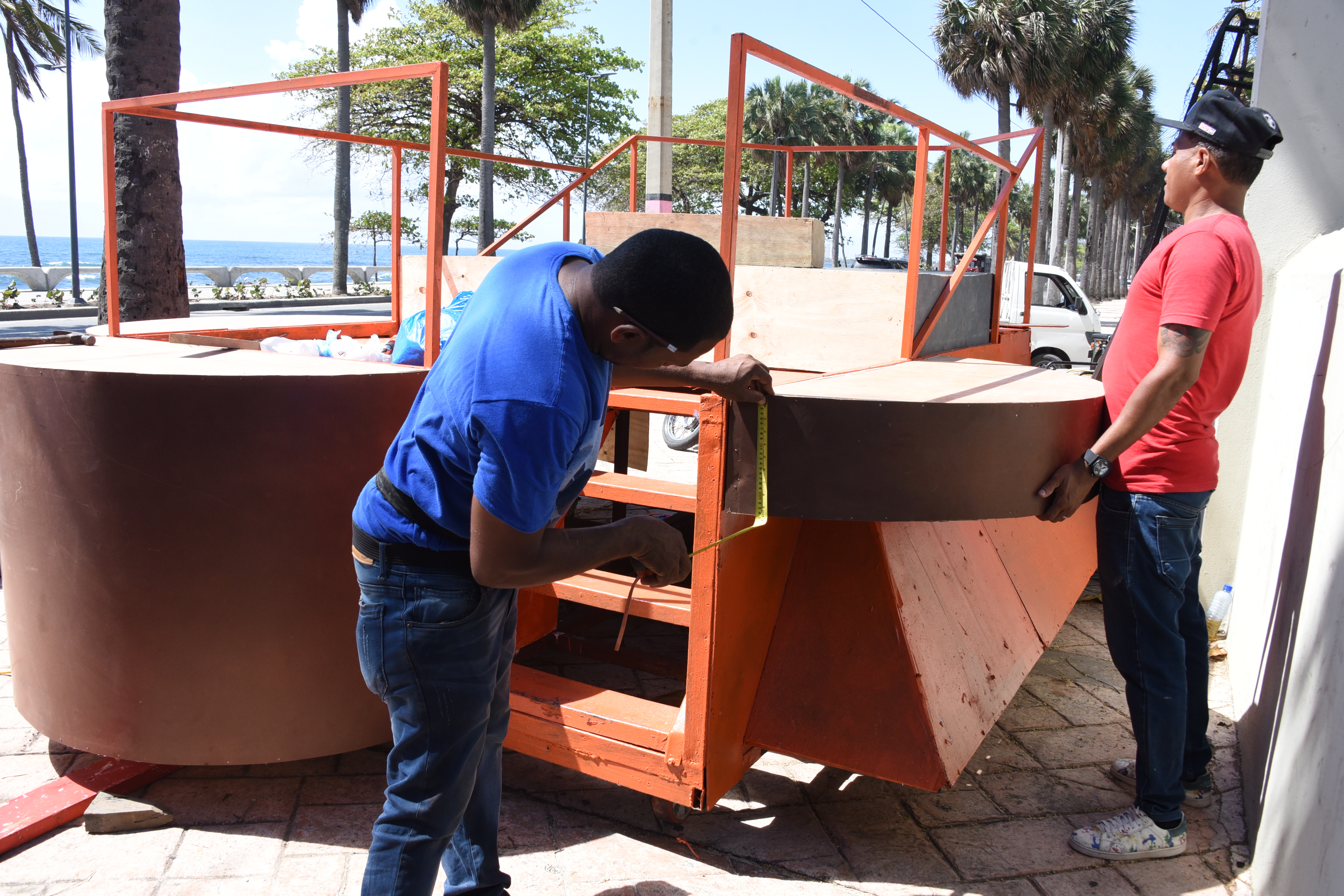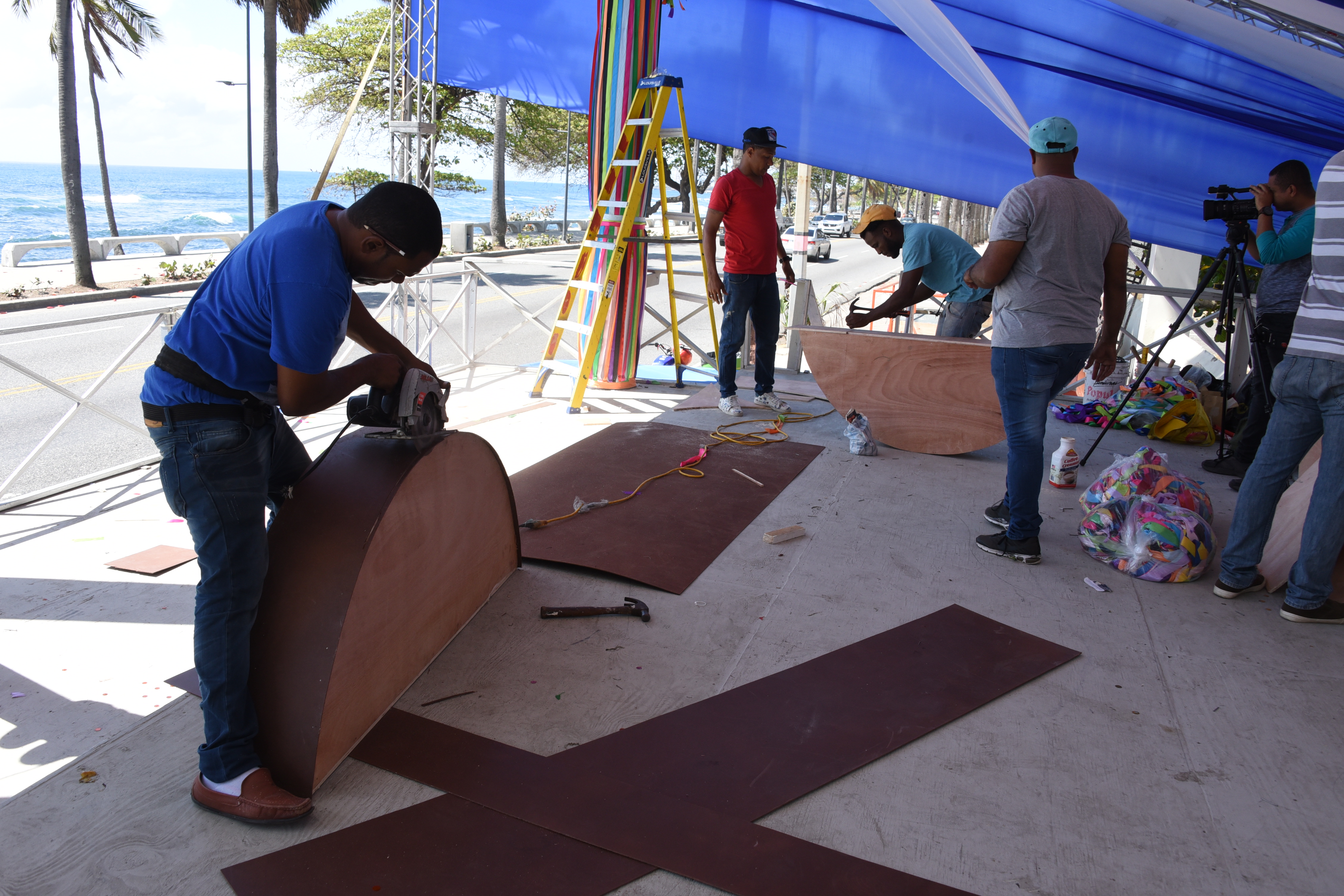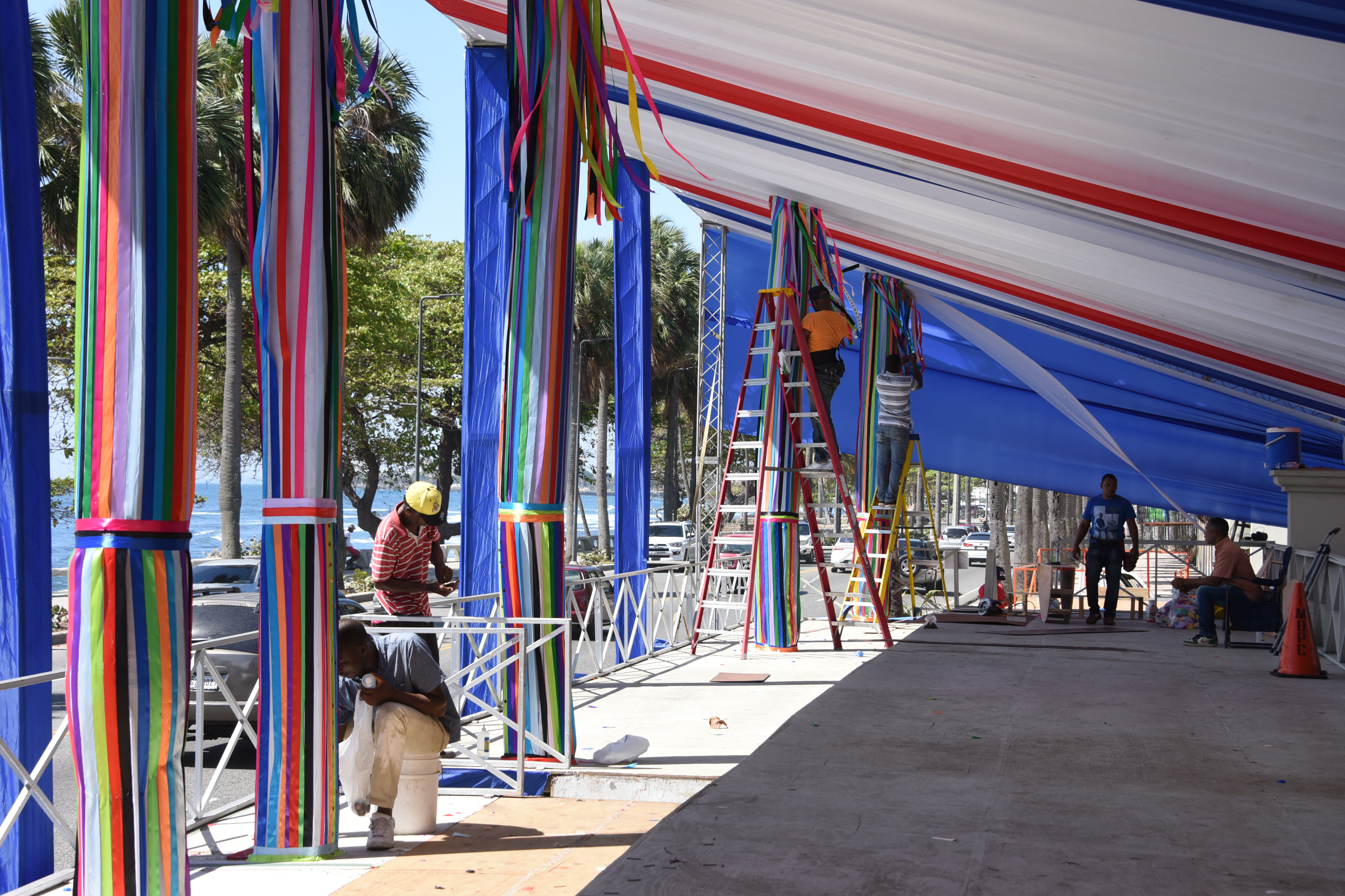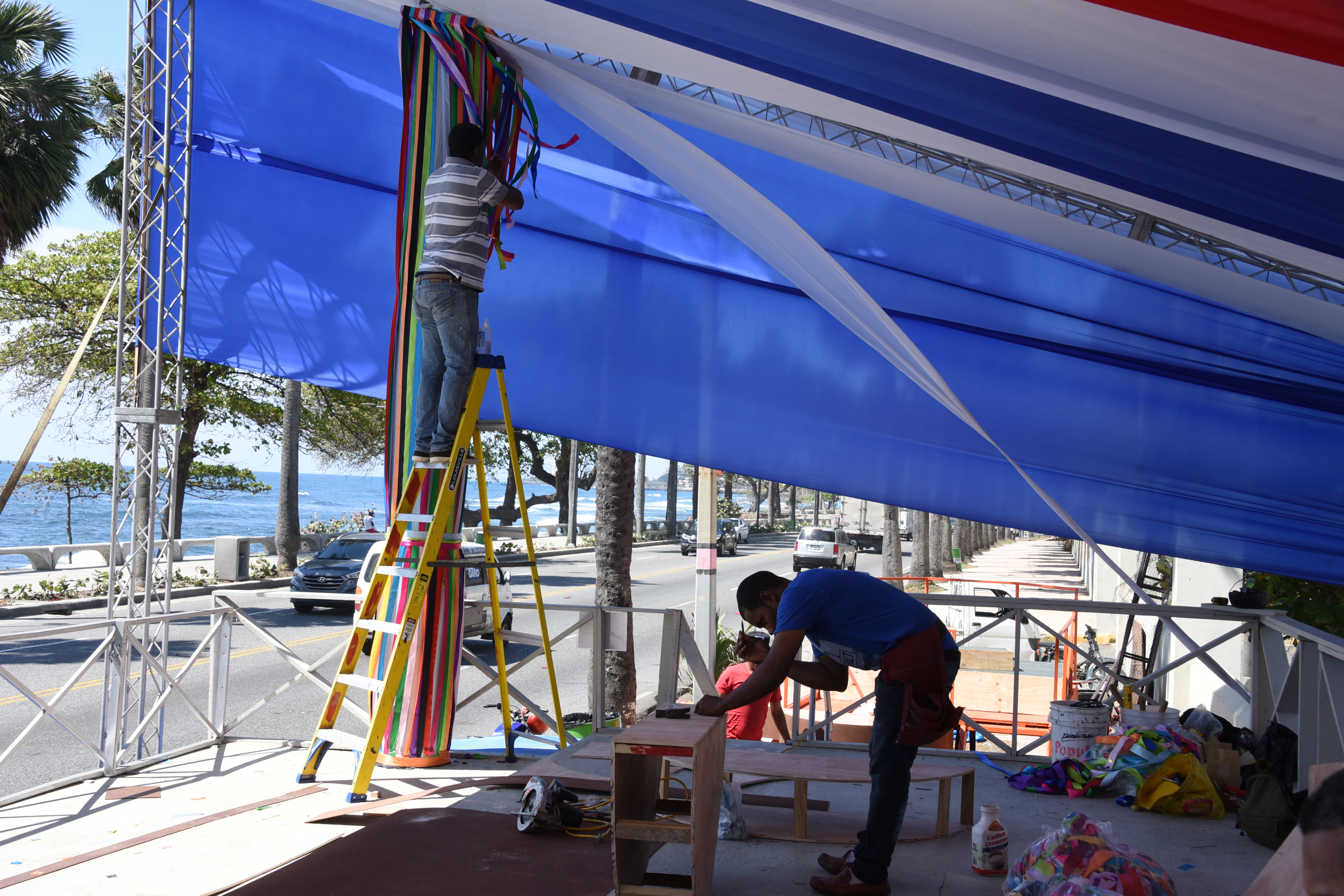 Decenas de obreros y técnicos trabajan arduamente en el montaje de la tarima del Desfile Nacional del Carnaval 2019, que arrancará a partir de las 2:00 de la tarde, en esta emblemática avenida de Santo Domingo.