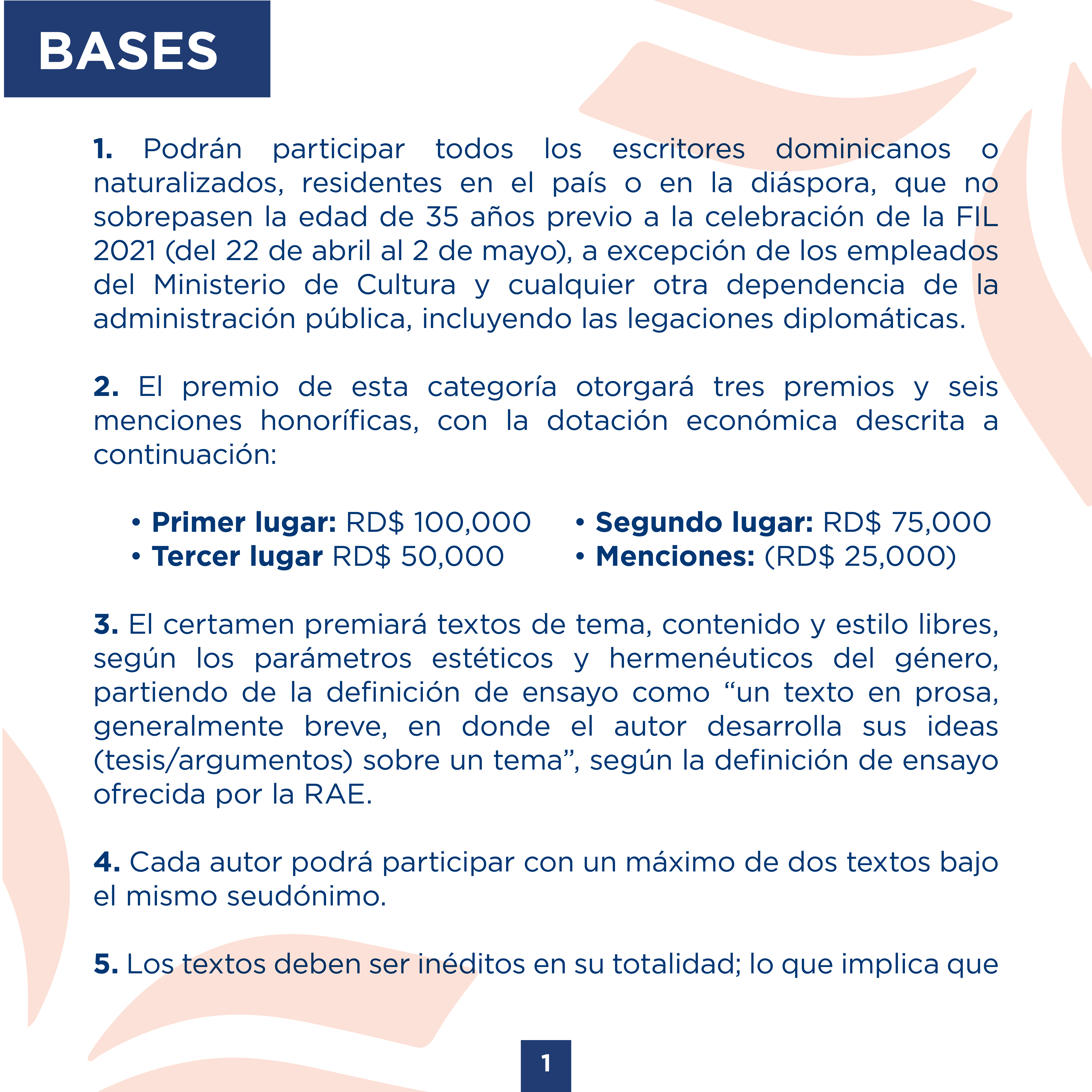 Podrán participar todos los escritores dominicanos o naturalizados, residentes en el país o en la diáspora, que no sobrepasen la edad de 35 años previo a la celebración de la FIL 2021 (del 22 de abril al 2 de mayo), a excepción de los empleados del Ministerio de Cultura y cualquier otra dependencia de la administración pública, incluyendo las legaciones diplomáticas.