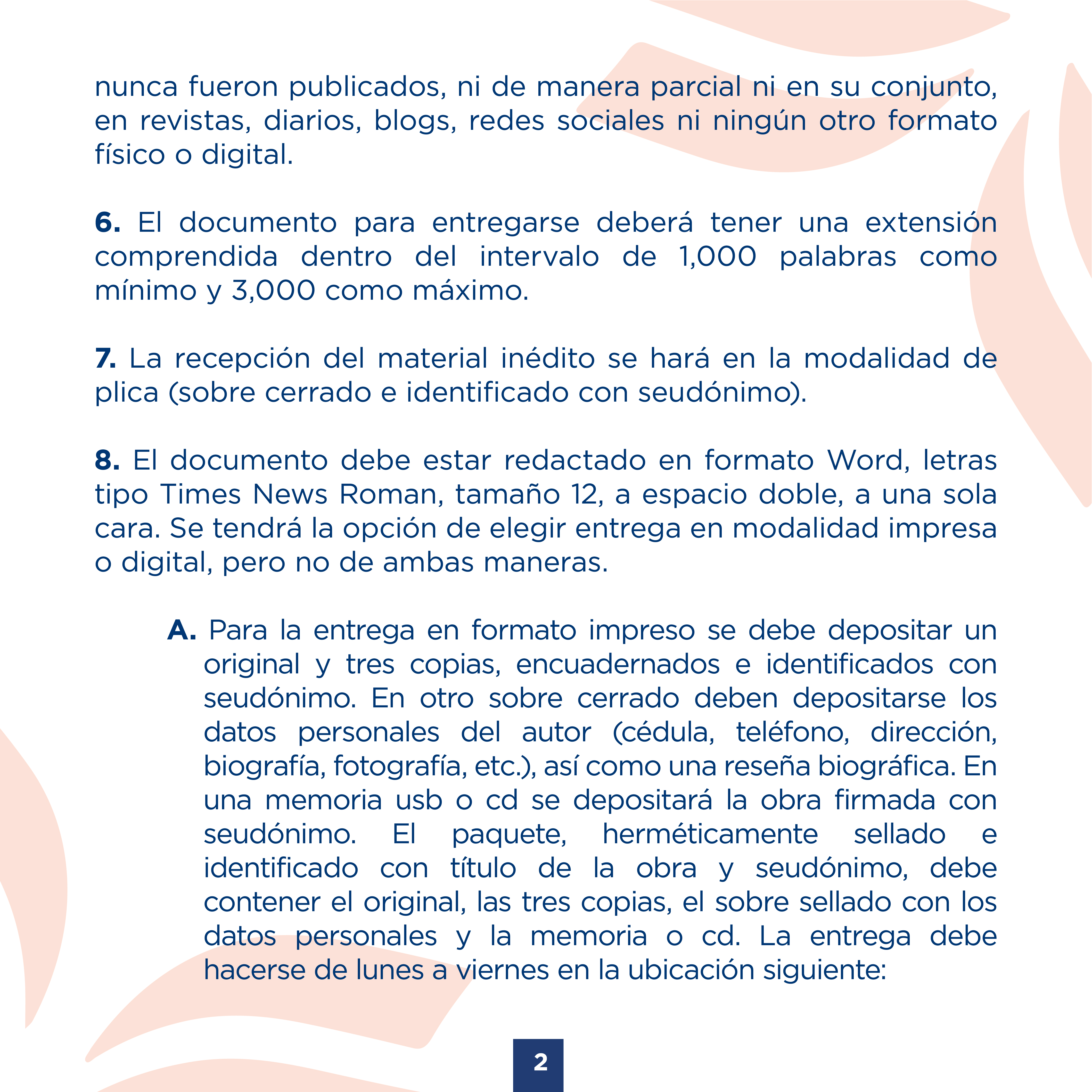 A. Para la entrega en formato impreso se debe depositar un original y tres copias, encuadernados e identificados con seudónimo. En otro sobre cerrado deben depositarse los datos personales del autor (cédula, teléfono, dirección, biografía, fotografía, etc.), así como una reseña biográfica. En una memoria usb o cd se depositará la obra firmada con seudónimo. El paquete, herméticamente sellado e identificado con título de la obra y seudónimo, debe contener el original, las tres copias, el sobre sellado con los datos personales y la memoria o cd. La entrega debe hacerse de lunes a viernes en la ubicación siguiente: