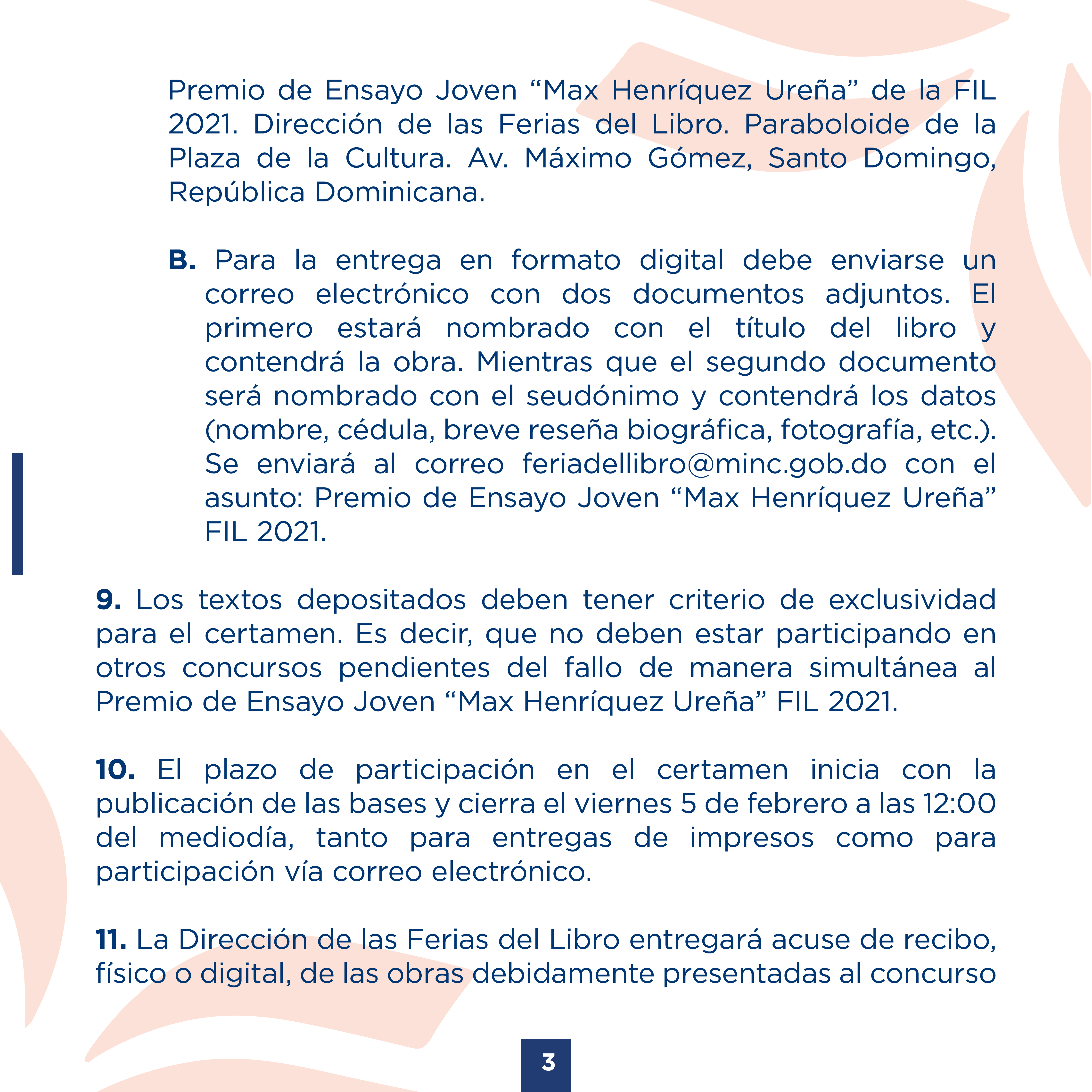 B. Para la entrega en formato digital debe enviarse un correo electrónico con dos documentos adjuntos. El primero estará nombrado con el título del libro y contendrá la obra. Mientras que el segundo documento será nombrado con el seudónimo y contendrá los datos (nombre, cédula, breve reseña biográfica, fotografía, etc.). Se enviará al correo Esta dirección de correo electrónico está siendo protegida contra los robots de spam. Necesita tener JavaScript habilitado para poder verlo. con el asunto: Premio de Ensayo Joven “Max Henríquez Ureña” FIL 2021