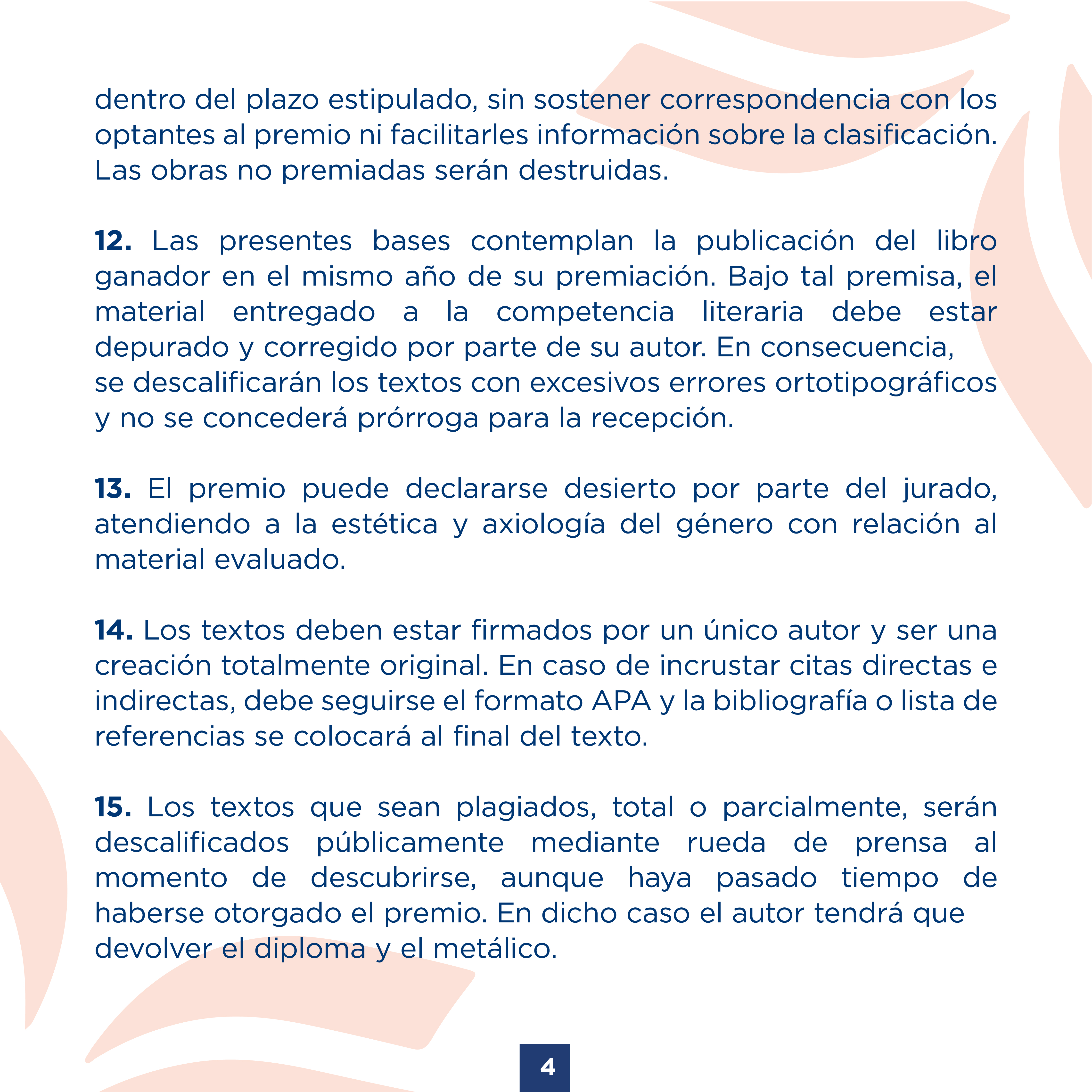 Las presentes bases contemplan la publicación del libro ganador en el mismo año de su premiación. Bajo tal premisa, el material entregado a la competencia literaria debe estar depurado y corregido por parte de su autor. En consecuencia, se descalificarán los textos con excesivos errores ortotipográficos y no se concederá prórroga para la recepción.