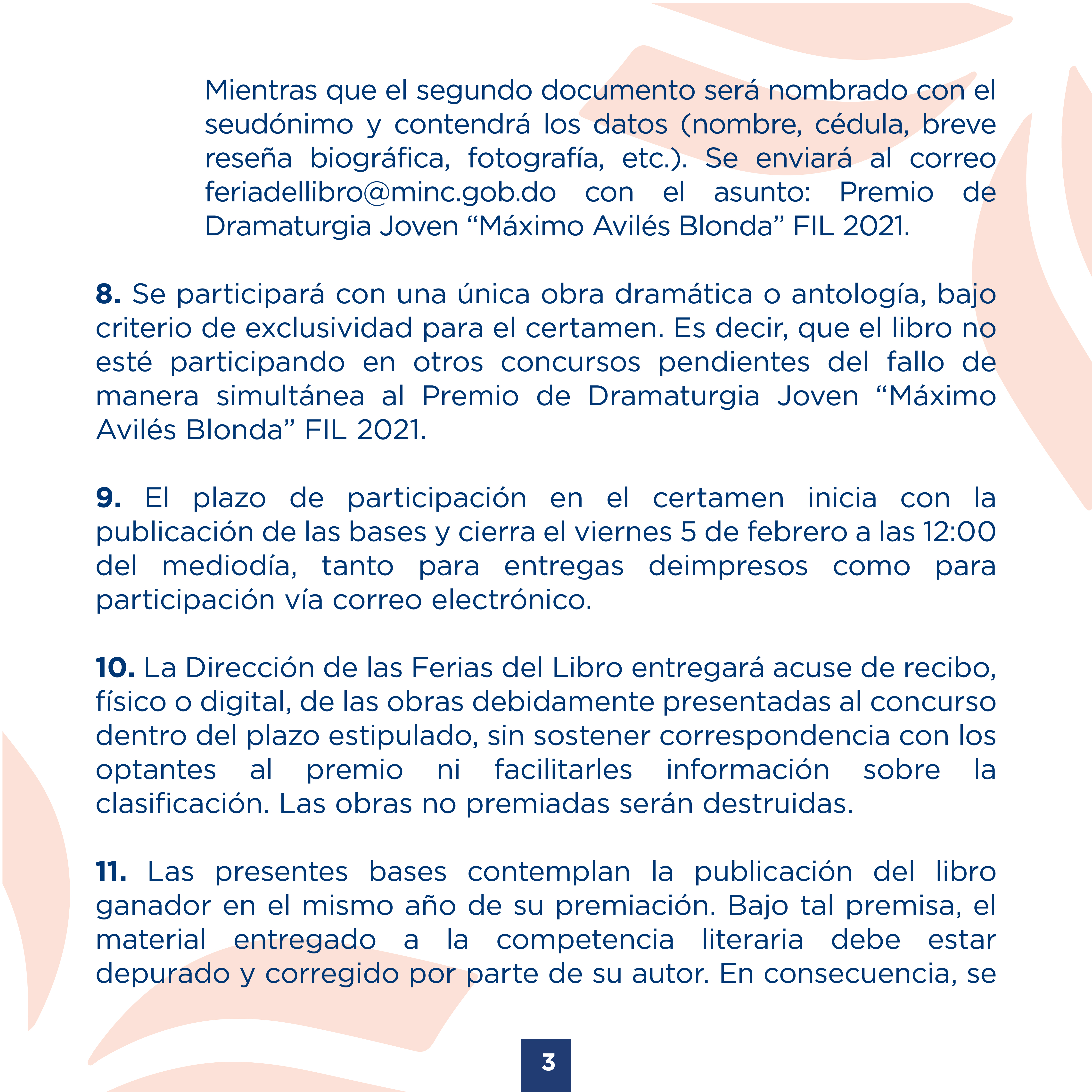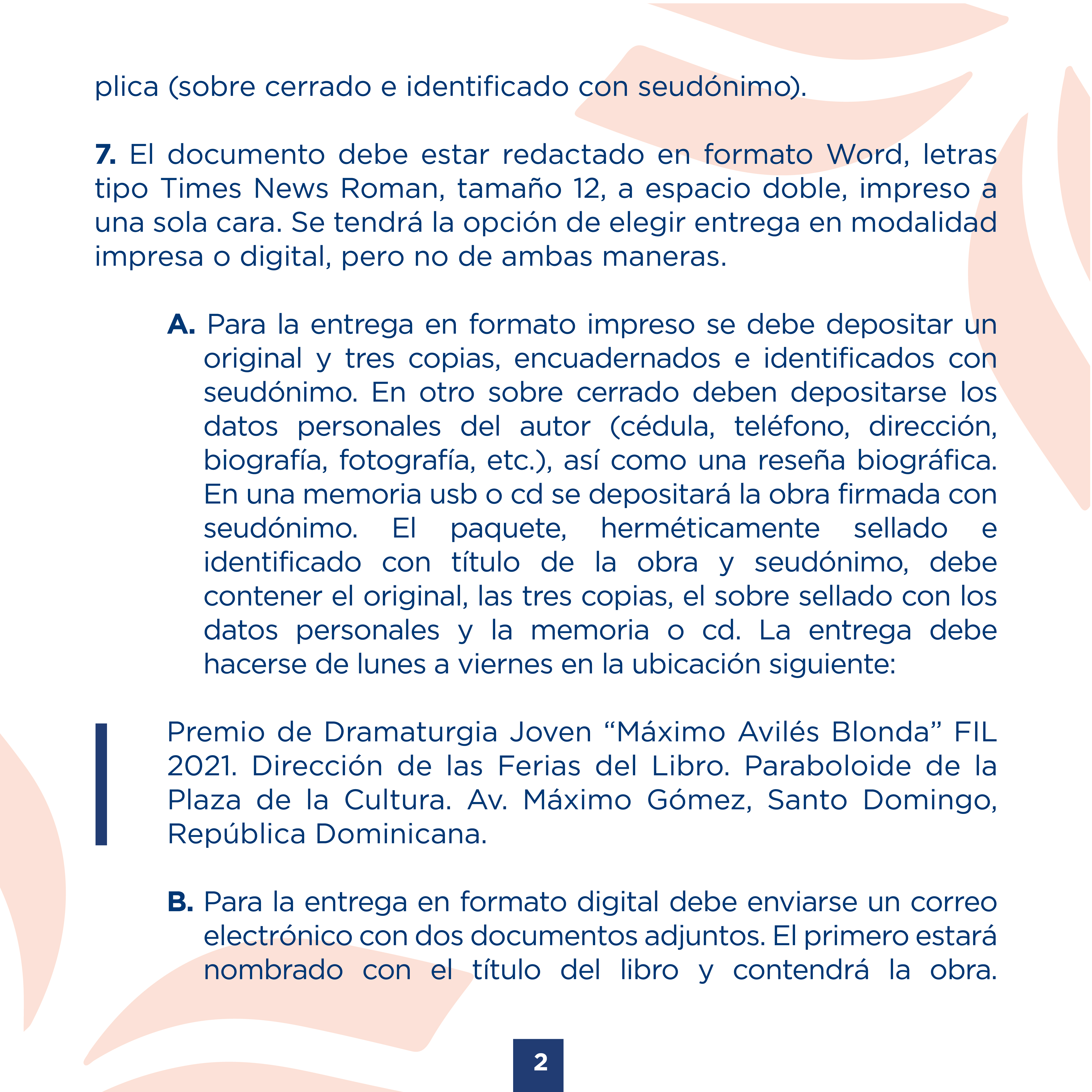 B. Para la entrega en formato digital debe enviarse un correo electrónico con dos documentos adjuntos. El primero estará nombrado con el título del libro y contendrá la obra. Mientras que el segundo documento será nombrado con el seudónimo y contendrá los datos (nombre, cédula, breve reseña biográfica, fotografía, etc.). Se enviará al correo Esta dirección de correo electrónico está siendo protegida contra los robots de spam. Necesita tener JavaScript habilitado para poder verlo. con el asunto: Premio de Dramaturgia Joven “Máximo Avilés Blonda” FIL 2021.