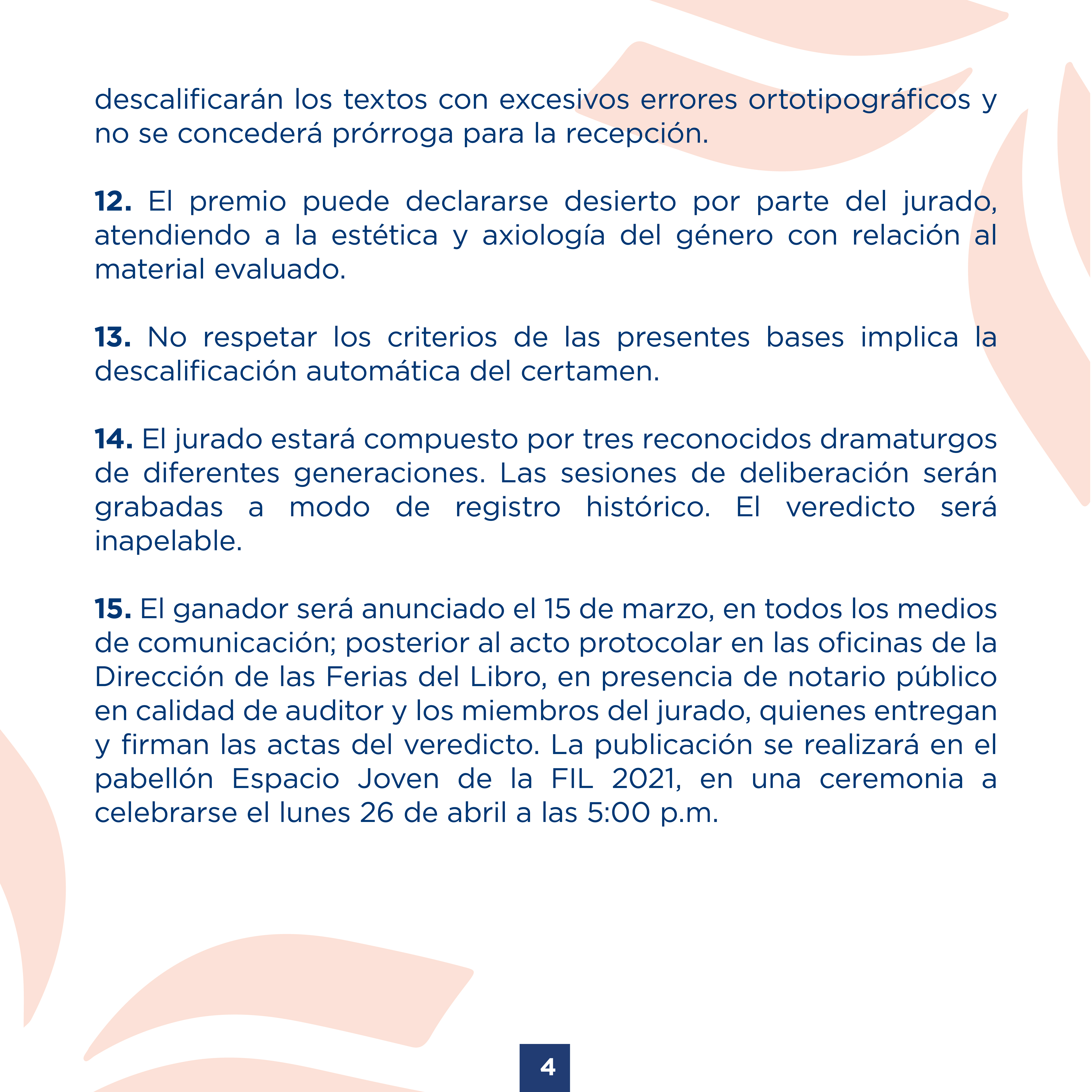 Se participará con una única obra dramática o antología, bajo criterio de exclusividad para el certamen. Es decir, que el libro no esté participando en otros concursos pendientes del fallo de manera simultánea al Premio de Dramaturgia Joven “Máximo Avilés Blonda” FIL 2021.