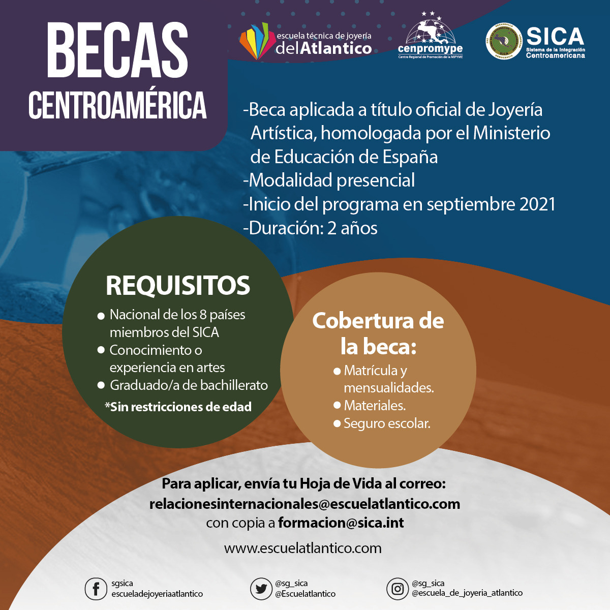 El programa ofrece dos (2) becas por cada país miembro del SICA, valoradas en €6000 por año académico, para aplicar al título internacional de Joyería Artística, un programa de dos años de formación presencial en España con cobertura para los conceptos de matrícula, materiales y seguro escolar, quedando por cuenta de las becarias y los becarios sufragar los costos de boleto aéreo y alojamiento. Cabe destacar que la titulación oficial es homologada por el Ministerio de Educación de España.