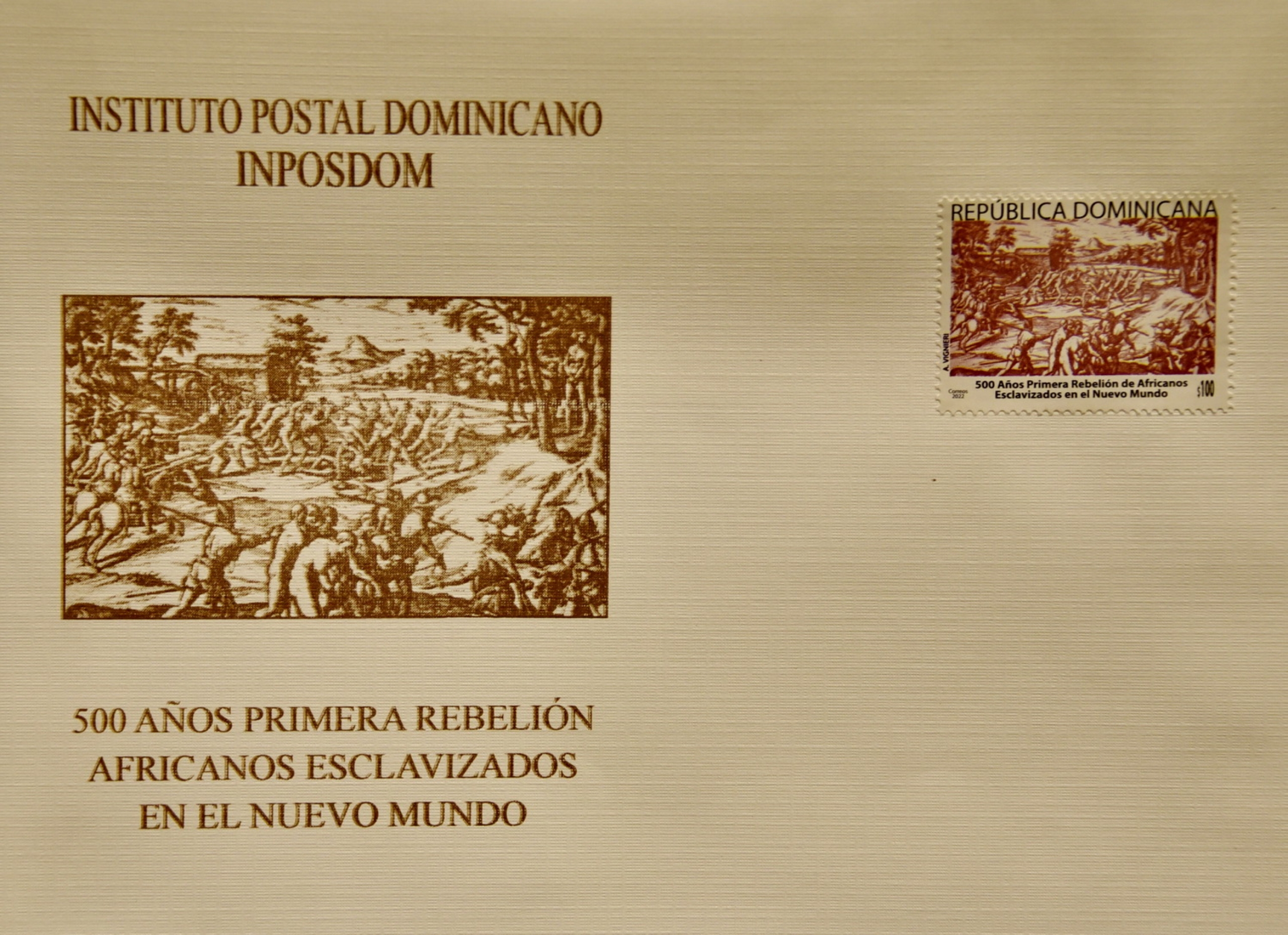 Santo Domingo. -El Ministerio de Cultura (MINC), a través de la Comisión Nacional Dominicana para la UNESCO y en colaboración con el Instituto Postal Dominicano (INPOSDOM), pusieron en circulación este martes el sello postal conmemorativo de los 500 años de la primera rebelión de africanos esclavizados en el Nuevo Mundo.